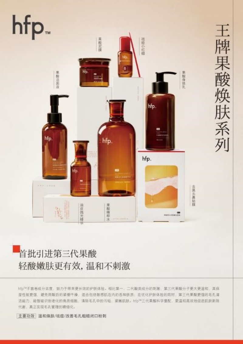 随着科研技术以及消费需求的迭代升级,hfp™前瞻性切入酸类赛道,并针对第三代果酸投入研发升级,相继推出了一系列果酸护肤产品,其中hfp™果酸精粹水已成为年销亿级的超级大单品,连续3年霸榜各大平台化妆水TOP1,成为人手一瓶的“小众宝藏单品”。